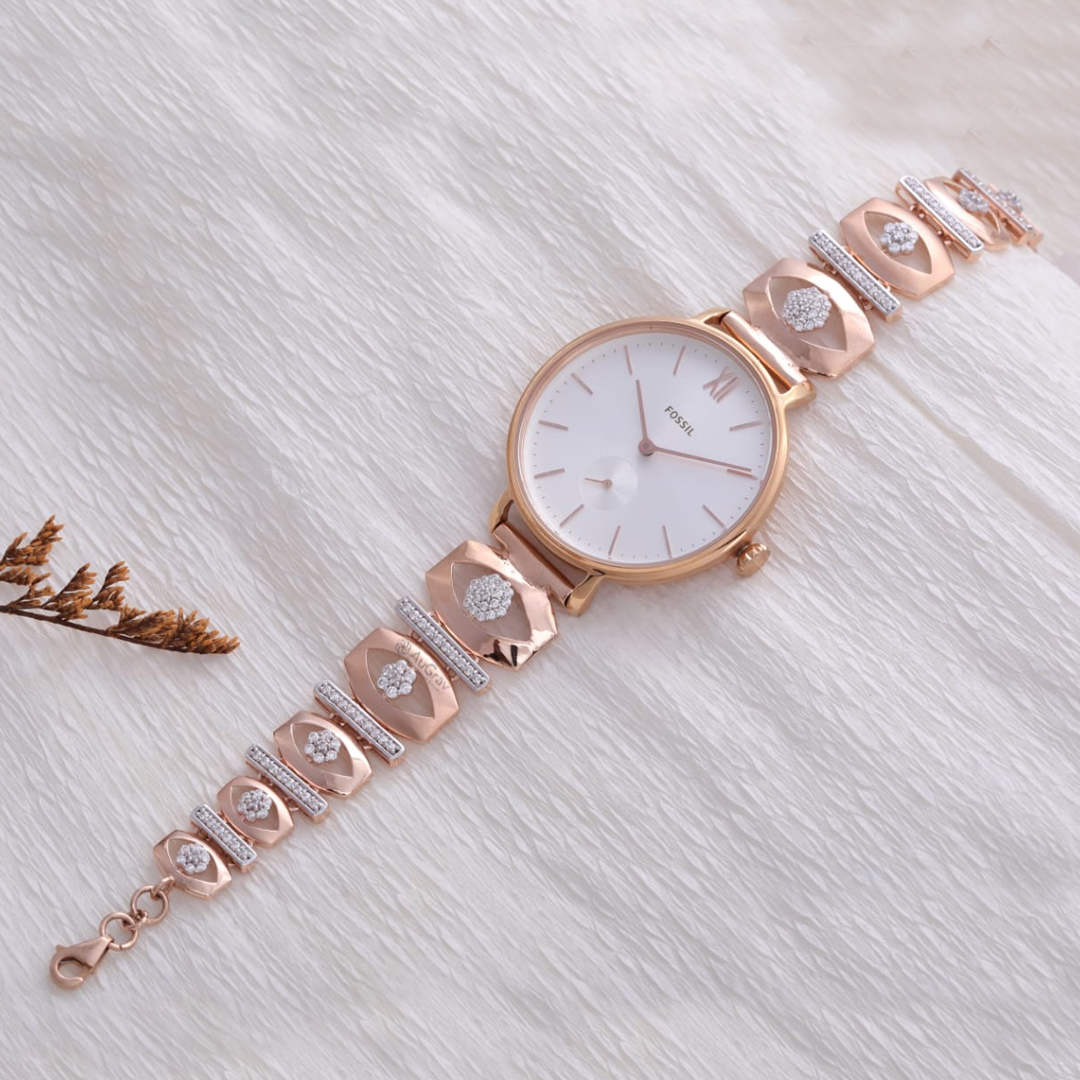 Rose gold case, mesh bracelet, minimalist dial, Japanese quartz movement.