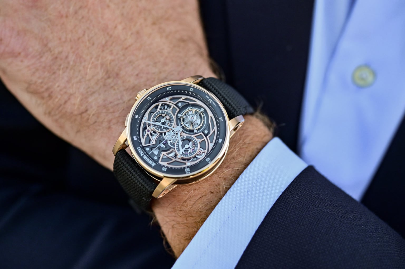 Tourbillon escapement, black DLC coating, skeleton dial, crocodile strap.
